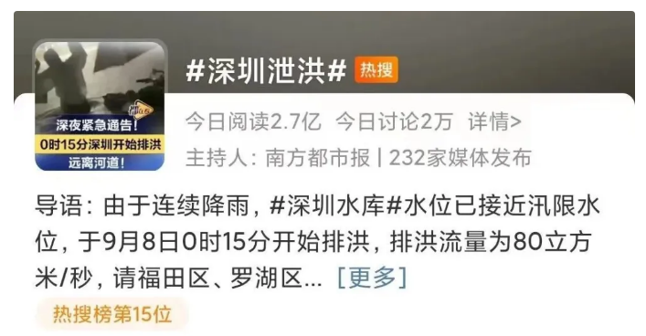 5日-9日,臺風(fēng)“海葵”先后兩次登陸福建、廣東。受其影響,南方多地出現(xiàn)特大暴雨,福建省、廣東省氣象臺多次發(fā)布“暴雨預(yù)警一級”。福州、廈門、漳州、深圳、廣州、佛山等城市內(nèi)澇嚴(yán)重,部分城市雨水齊腰,短時間強降雨超過100毫米,深圳降雨量更是打破1953年以來的降雨極值,地鐵灌水,深圳泄洪多次登上各大平臺的熱搜第一。