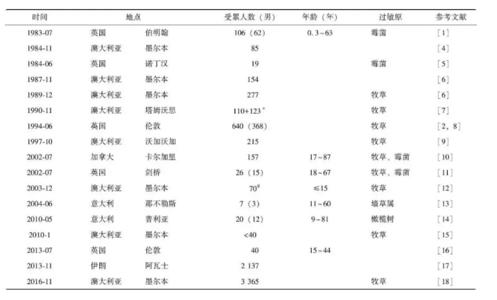 此后,陸續(xù)在全球范圍內(nèi)均有雷暴哮喘事件的相關(guān)報道,主要發(fā)生在英國、澳大利亞,另外加拿大、意大利、伊朗等國家也有類似報道。(下方表格中總結(jié)了自1983年以來文獻報道過的雷暴哮喘事件)